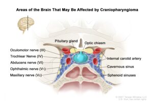 Craniopharyngioma is a rare and benign brain tumor that affects the central nervous system (CNS). Because it is located close to important brain structures like the pituitary gland, optic nerves, and hypothalamus, it can still cause major health problems even though it is not cancerous. Although it can happen at any age, it usually affects kids between the ages of 5 and 14.